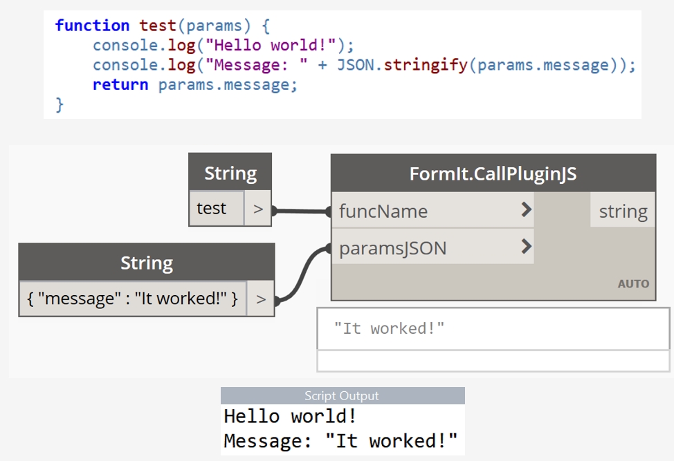 FormIt 2022.1 y versiones posteriores ofrecen acceso a las API de JavaScript y a las funciones personalizadas de Dynamo mediante los dos nuevos nodos siguientes: