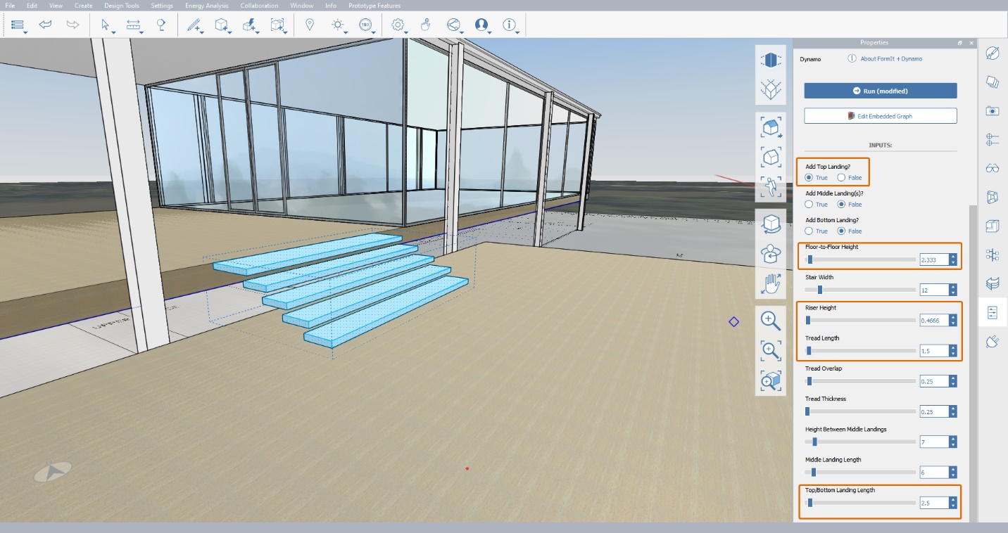 Note: If you set Add Bottom Landing to true and re-run the script, the bottom landing’s top face should align with the Lower Terrace Floor’s top face. This is happening because – differently from the previous stairs - we adjusted the Riser Height to match the Floor-to-Floor Height to the true height we want (2’-4” or 2.333’).