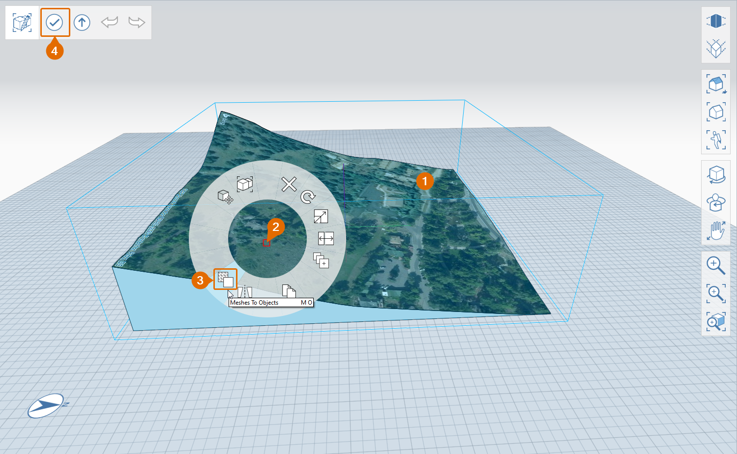 3 – The 3D terrain is imported as a mesh object, but before modifying it, the terrain must be converted to a FormIt geometry Object. This can be done using the Meshes to Objects (MO) tool: