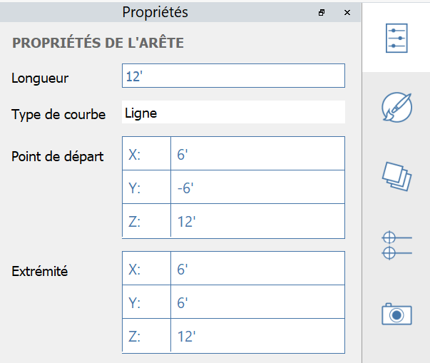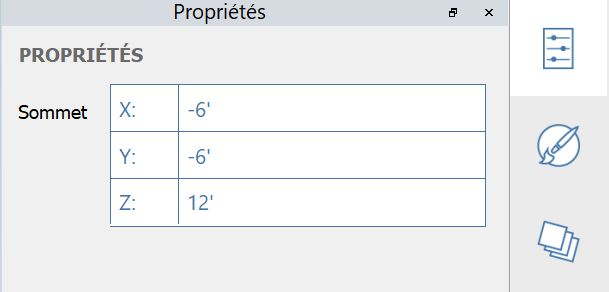 Dans FormIt 2023 et les versions ultérieures, vous avez la possibilité de modifier les propriétés d’un sommet, d’une arête, d’une face et d’un volume à l’aide de la palette Propriétés :