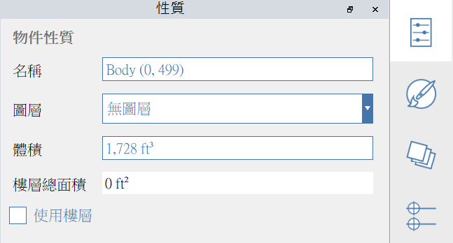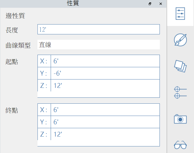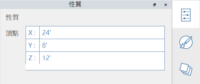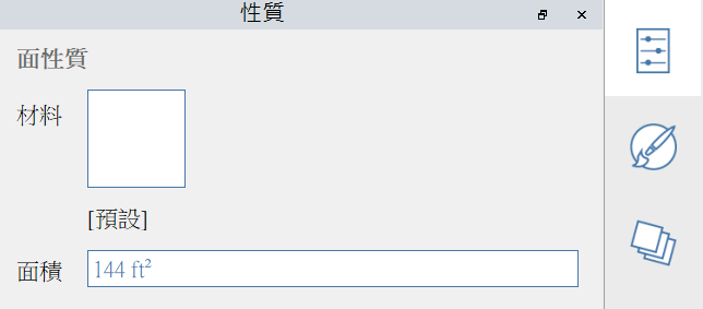 **性質選項板**顯示與 Formit 工作平面中所選物件相關的資訊和資料。